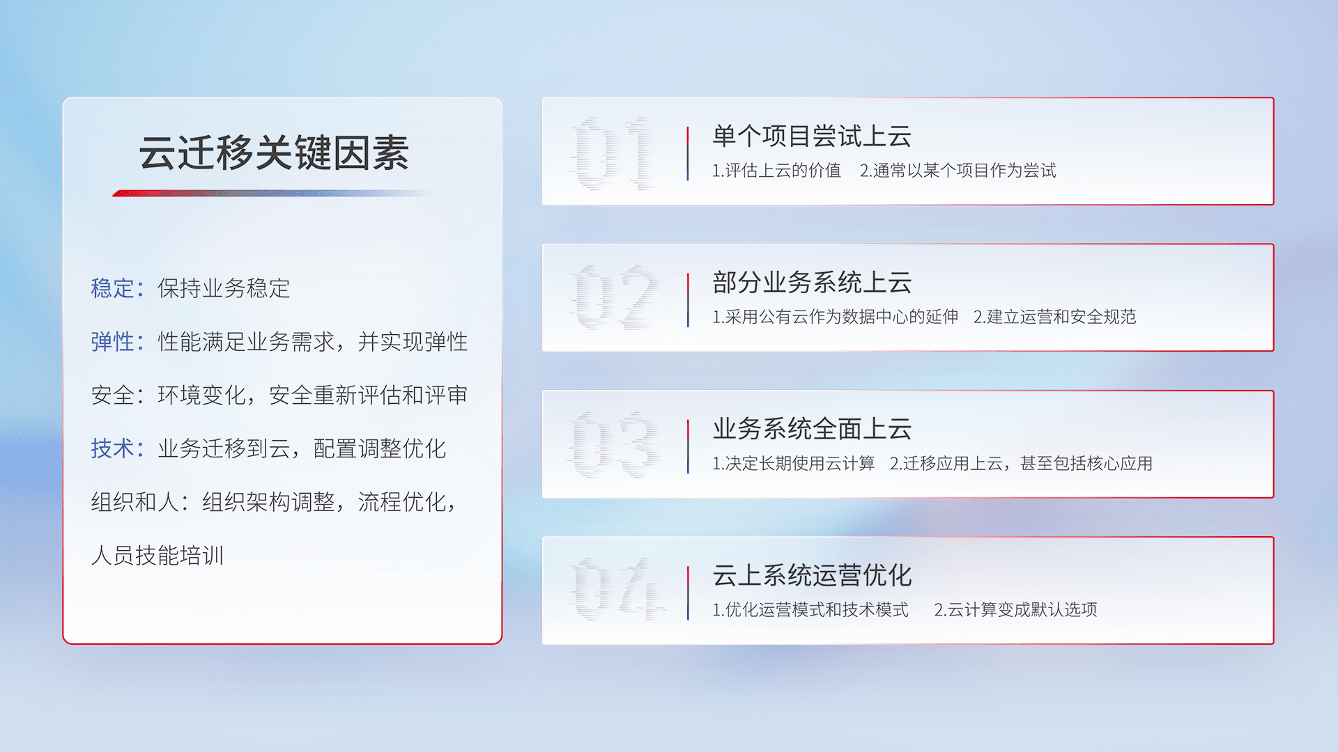 结合实际业务,,从规划设计、、、云平台选型、、、云原生改造、、数据迁移、、、集成交付,,迁移全过程为客户识别最佳上云路径,,,,做好风险识别管理,,,,设计网络架构、、、、身份权限、、、安全审计合规、、、操作审计、、、、日志审计、、监控告警策略、、多站点容灾设计等,,,,对云上基础设施进行整体规划,,,提升IT治理水平,,,以满足弹性、、、高可用、、、高性能的需求。。。。