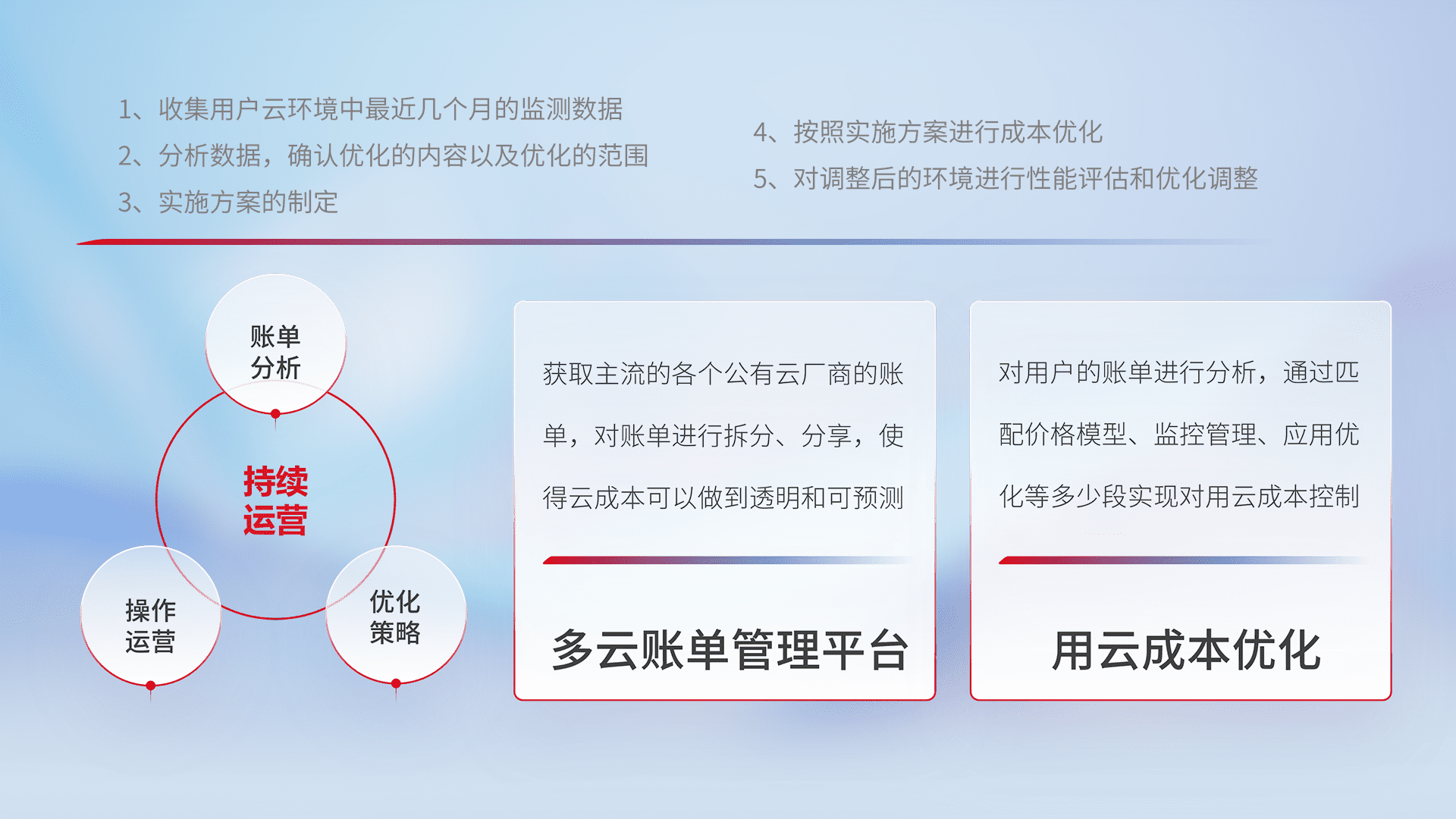 通过灵活运用多种自动化迁移工具,,,,帮助企业用户实现业务和数据高效 、、、、稳定的上云迁移和云上迁移,,采用自研多云纳管平台,,,,以中立管理模式,,,,解决多组织、、多云、、、、多运维厂商的复杂关系的管理,,,保证多云平台资源配置的一致性,,,实时掌控云资源运行数据,,,,运用智能化工具分析云资源多云平台的管理服务,,透明化管理成本支出,,,用云成本可预测、、、用云费用可优化、、云资源配额有据可依。。